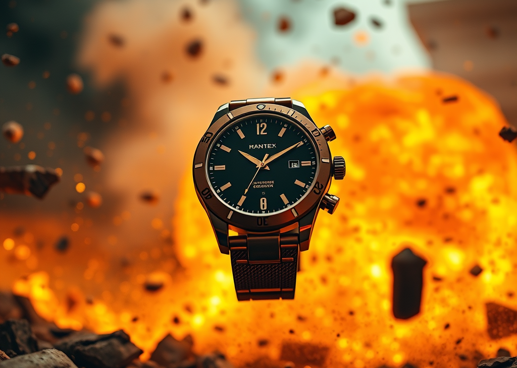A close-up, low-angle shot captures a watch suspended in mid-air amidst an explosion. The watch, a metallic brown with a dark face, is positioned slightly off-center to the right, with its band extending downwards. The explosion behind it is a chaotic blend of fiery orange and yellow light, with debris and smoke filling the background. Rocks and fragments of various sizes are scattered around the watch, some appearing to be in motion, adding to the dynamic and destructive atmosphere of the scene. The lighting is dramatic, with the bright explosion illuminating the watch and casting shadows, creating a sense of intense action and resilience.